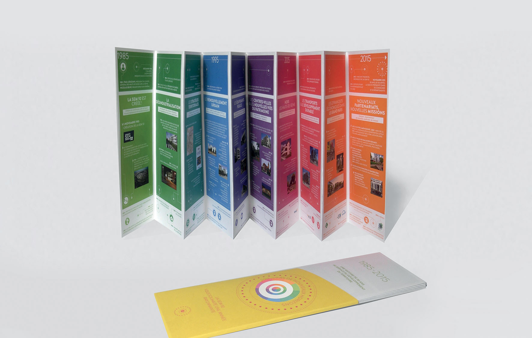 En 2015, la SEM 92 (aujourd'hui Citallios) fêtait ses 30 bougies. Pour elle, l'agence a conçu une carte de voeux sous la forme d'un dépliant au dégradé coloré qui revient sur 30 ans d'aménagement. ***