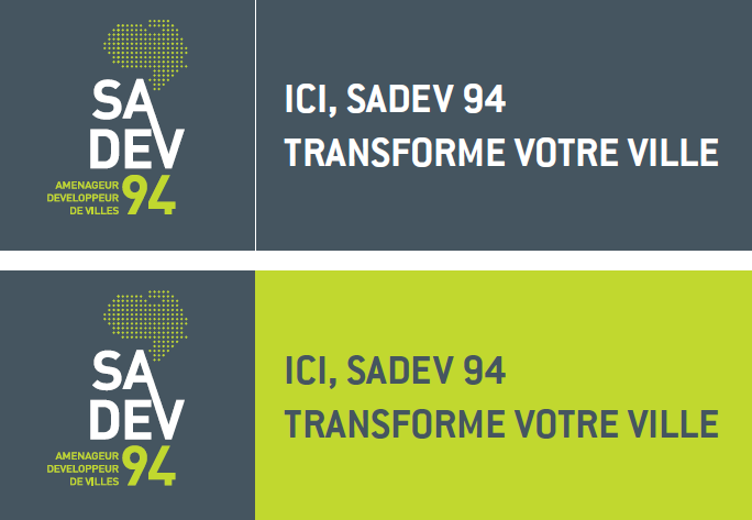 L'agence a conçu le logo et la signature de la Sadev 94 et décliné l'ensemble de la charte graphique (cartes de visite, cartes de correspondances, papier à en-tête, chemises, masques Powerpoint...). Elle a également réalisé une déclinaison pour la fondation Sadev Mali et une version événementielle à l'occasion des 30 ans de l'entreprise en 2016. ***