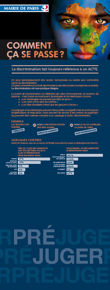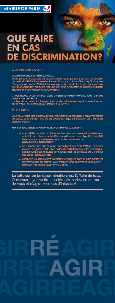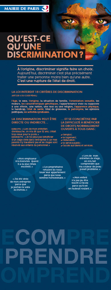 Dans le cadre de l’exposition « Lutte contre les discriminations et Droits de l’Homme », la Mairie de Paris nous a demandé de concevoir les panneaux présentés aux visiteurs. ***